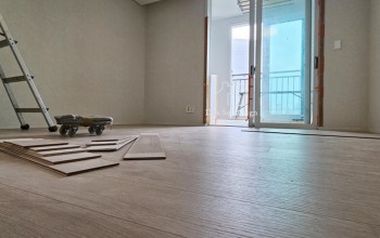 선택된 강마루가 평활하게 잘 시공된 모습입니다.멜란지 베이지는 베이지 계열 컬러로 따스하면서 차분한 분위기를 만들어줍니다.아파트 바닥재 강마루 시공은 실리콘 작업으로 깔끔한 마…