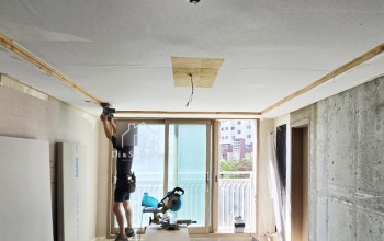 먼저 천장 목공사를 진행하는 모습입니다. 거실 등 박스 내부 기존 마감재 철거를 합니다.천장 레벨을 맞춰 내부 새로운 천장틀을 만들어 주기 위해 기존 마감재는 꼼꼼하…