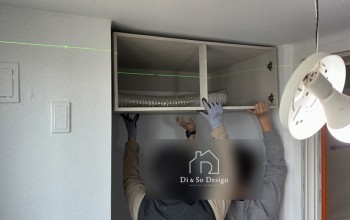 주방은 싱크대 설치와 함께 다용도실 냉장고 수납장 설치가 진행되었는데요.포그 그레이 컬러로 냉장고 상부 수납장을 맞춤 제작해 주방 가구와의 일체감을 높여주고 깔끔한 무드를…